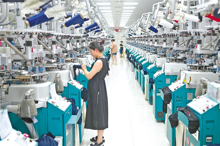 图为8月28日,工作人员在位于安华镇的涧澜袜业有限公司智能生产车间检验成品袜的质量。新华社记者 翁忻旸 摄