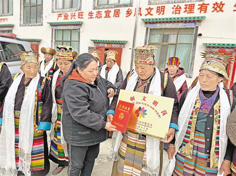 图为山南市琼结县妇联工作人员为琼结琼果纳雄畜牧业农牧民专业合作社发放“巾帼文明岗”牌匾。