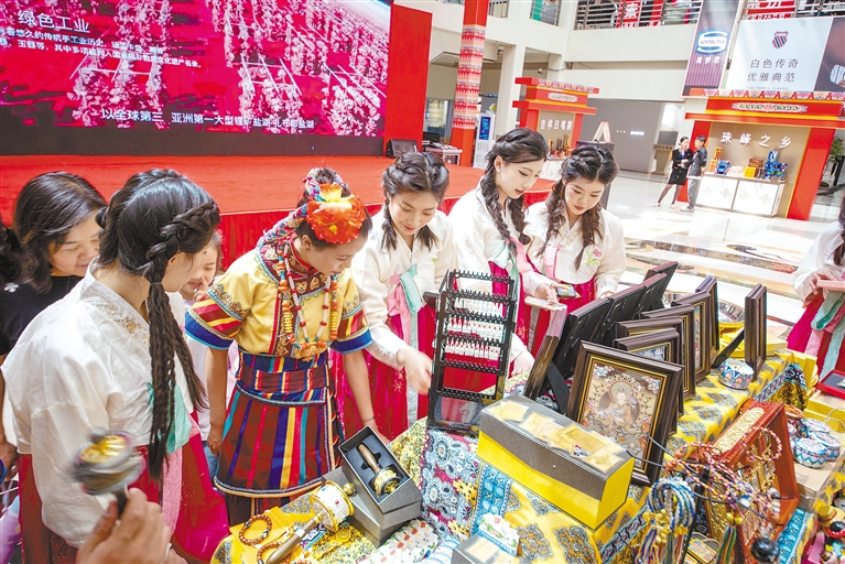 图为在吉林举办的“藏品入吉”展销会上,游客在选购日喀则文创产品。(图片由吉林省援藏工作队提供)