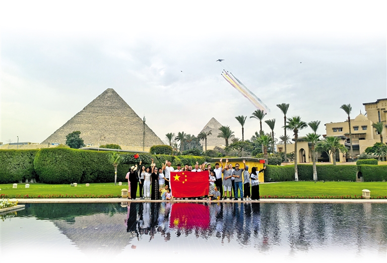 当地时间28日中午,中国空军1架运-20与空军八一飞行表演队6架歼-10表演机编队飞越金字塔上空,歼-10表演机在空中拉出象征中埃两国国旗颜色的6道彩烟,吉萨金字塔景区内的观众争相合影留念。