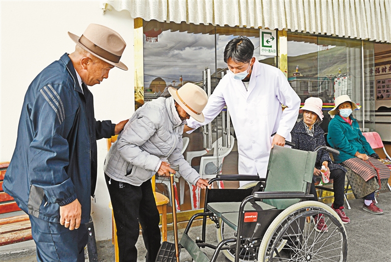 图为山南市乃东区特困人员集中供养服务中心工作人员在照顾行动不便的老人。 本报记者 旦增兰泽 摄
