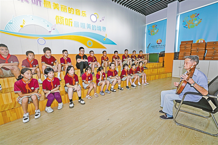 图为95岁的摊簧技艺传承人周才高给安华镇中心学校的学生们表演摊簧。