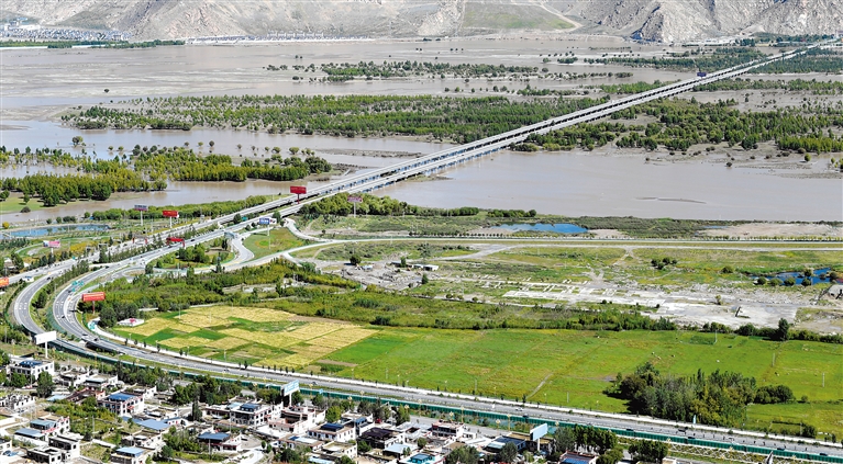 图为鸟瞰雅鲁藏布江上的雅江特大桥。 本报记者 旦增兰泽 摄