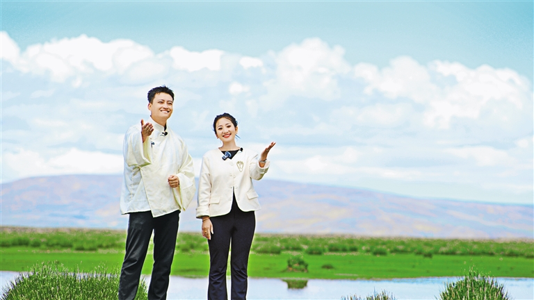 图为色尼区文化和旅游局副局长塔巴曲珍(右)与歌手罗布桑珠录制宣传视频。本报记者 万靖 摄