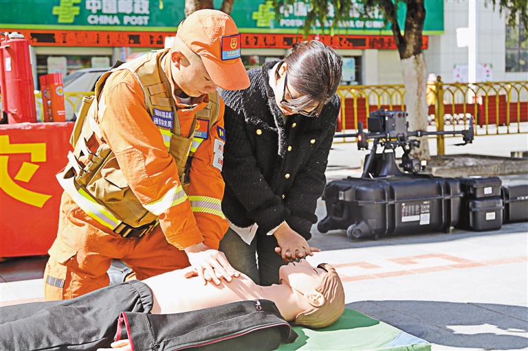 日喀则市森林消防大队官兵在日喀则市街头向市民教授水域救援方法。