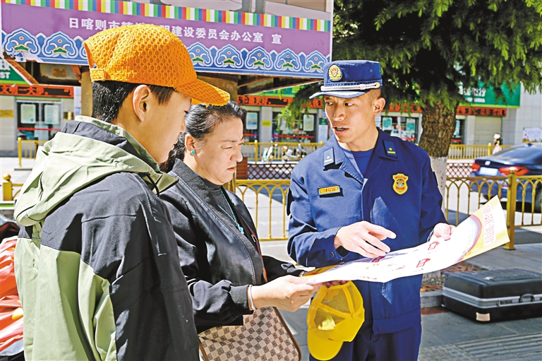 日喀则市森林消防大队官兵在日喀则市街头向市民宣传水域救援知识。洛桑顿珠 本报记者 旦增旺姆 摄