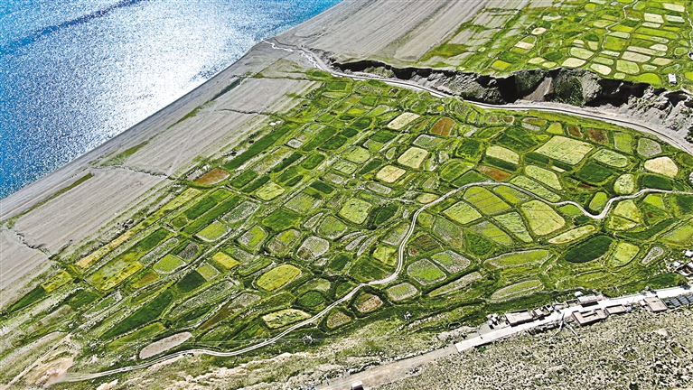 那曲市尼玛县文布南村位于当惹雍错湖畔,海拔超四千六百米,具有典型的藏北高海拔农业景观。 图为鸟瞰文布南村当惹雍错湖畔耕地。本报记者 万靖 摄