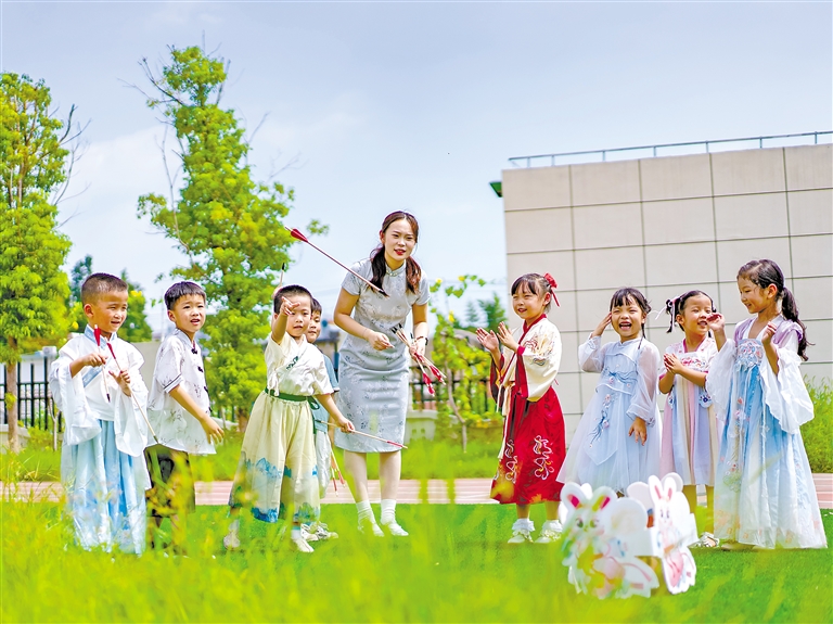 近日,多地举办传统民俗活动,迎接中秋佳节。 图为9月8日,在江苏省兴化市文林幼儿园,小朋友们进行投壶比赛。 新华社发(周社根 摄)