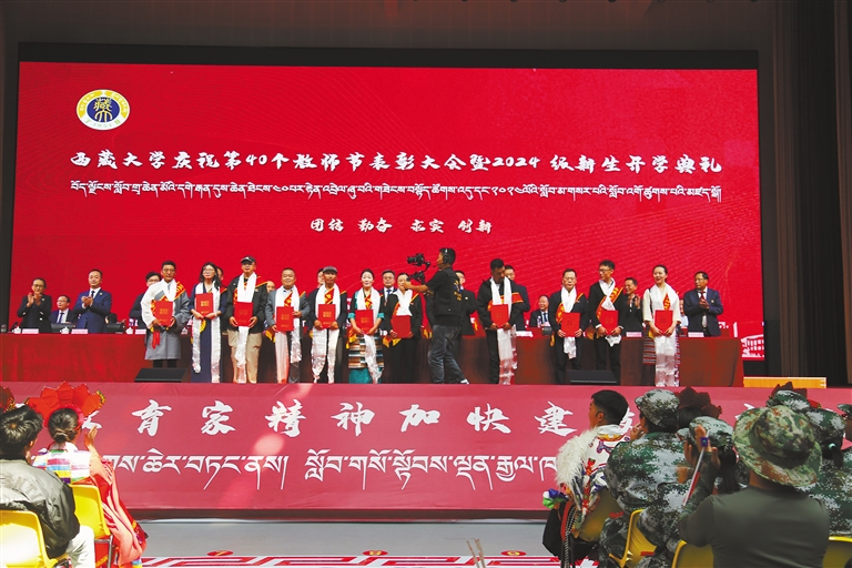 10日下午,西藏大学在纳金校区双创活动中心举办第40个教师节表彰大会暨2024级新生开学典礼。活动在热情欢快的暖场歌舞中拉开帷幕,会场内红旗飘扬,气氛热烈而庄重,全体2024级新生、学校各单位主要负责人、受表彰师生代表等共计3300余师生齐聚一堂,共同见证这一重要时刻。