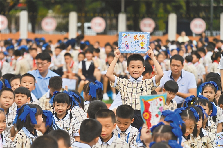 图为9月10日,南宁市滨湖路小学的学生展示送给老师的手绘作品。