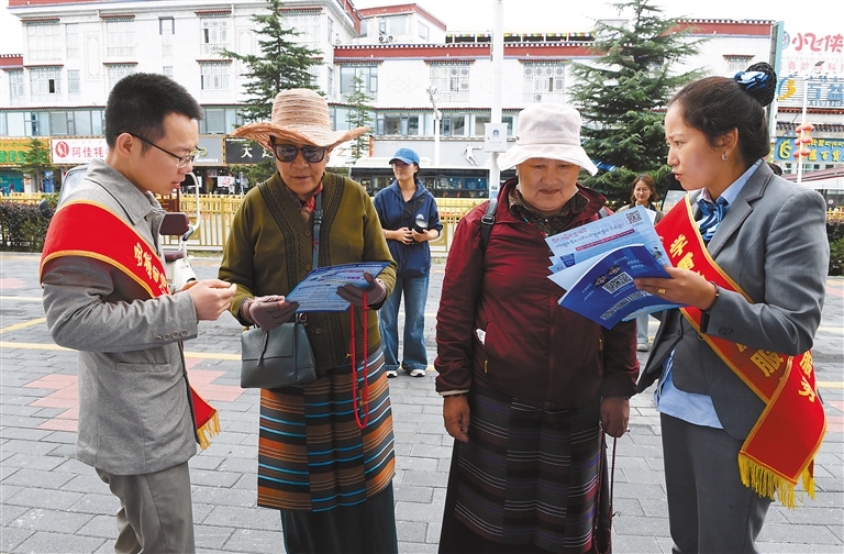 9月11日,西藏电信网络和信息安全管理部围绕网络安全政策法规、数据安全、防范电信网络诈骗、个人信息保护等开展“电信日”活动。图为工作人员为过往群众普及网络安全知识。 本报记者 旦增兰泽 摄