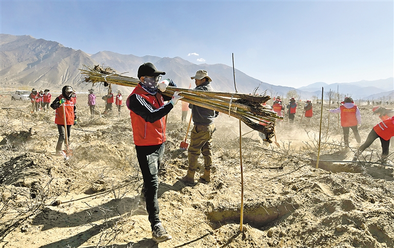 近年来,山南市坚定践行“绿水青山就是金山银山”的理念,扎实推进造林绿化、防沙治沙工程,为具备条件的荒山荒原披上绿装。图为山南市桑日县干部职工在河滩边植树(资料图片)。本报记者 唐斌 摄