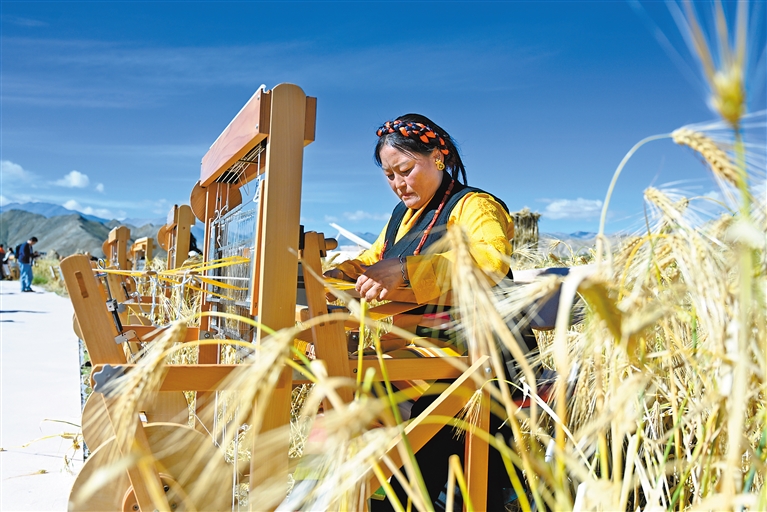 万里晴空下,金色青稞随风摇曳,静等丰收的季节;希望的田地上,在传承和创新中,千年氆氇再现辉煌。