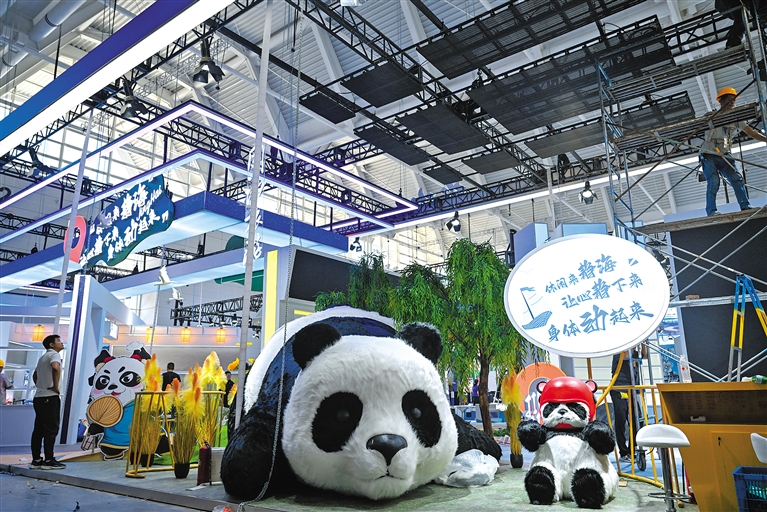 图为 9月12日,工作人员在国家会展中心(天津)内布展施工。新华社记者 孙凡越 摄
