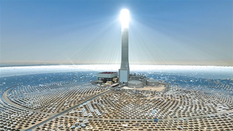 从阿联酋迪拜市区出发向南约65公里,在一望无垠的沙漠腹地,高达262米的集热塔巍然耸立,高塔下约7万面定日镜组成的镜场呈辐射状环绕延伸。这里是中国和阿联酋共建绿色丝绸之路重点合作项目——迪拜马克图姆太阳能公园四期光热光伏综合发电项目。2018年11月,上海电气集团股份有限公司以EPC总承包方式承建该项目,总装机容量950兆瓦,其中包括700兆瓦光热发电机组和250兆瓦光伏发电机组。今年2月,项目所有发电机组均已实现并网发电并投入商业运行,累计发电量达35亿千瓦时。