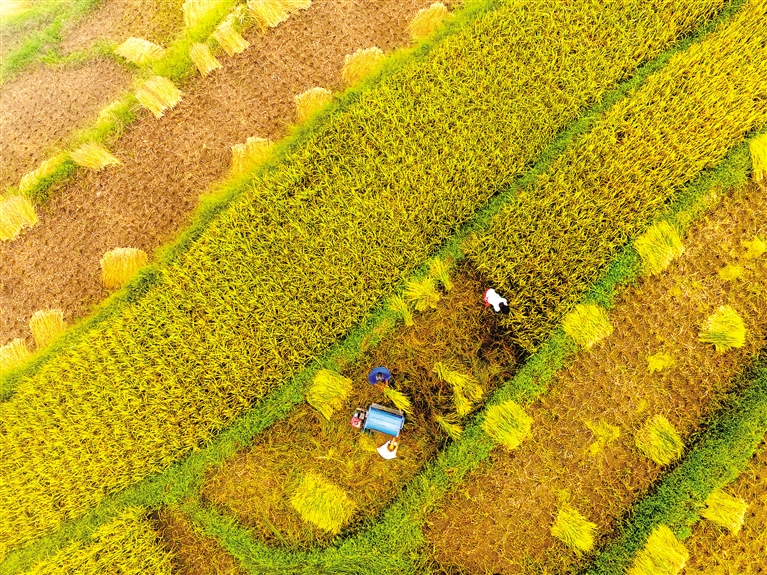 金秋是收获的季节,神州大地呈现一派喜人的“丰”景。图为9月13日,在云南省昭通市绥江县中城镇回望村,村民在收割水稻(无人机照片)。新华社发(曾三东 摄)