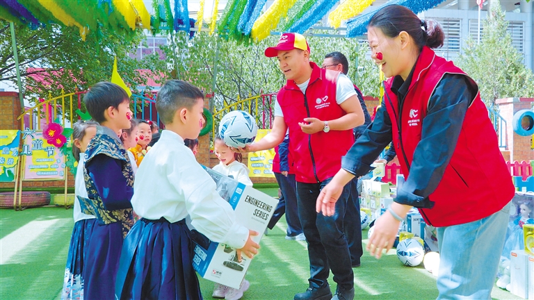图为公司员工在给孩子们赠送礼物。艾坚 本报记者 卢文静 摄