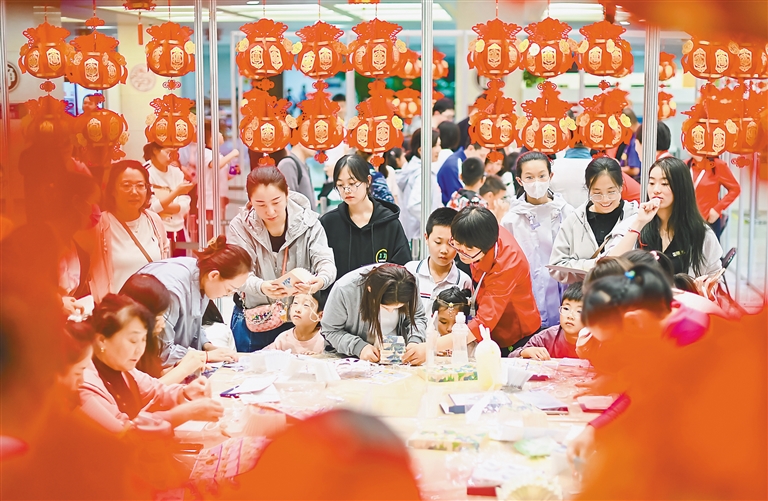 图为9月14日晚,在吉林省图书馆举办的“诗词醉月 图书馆中秋之夜”活动现场,市民们体验制作花灯。 新华社记者 颜麟蕴 摄