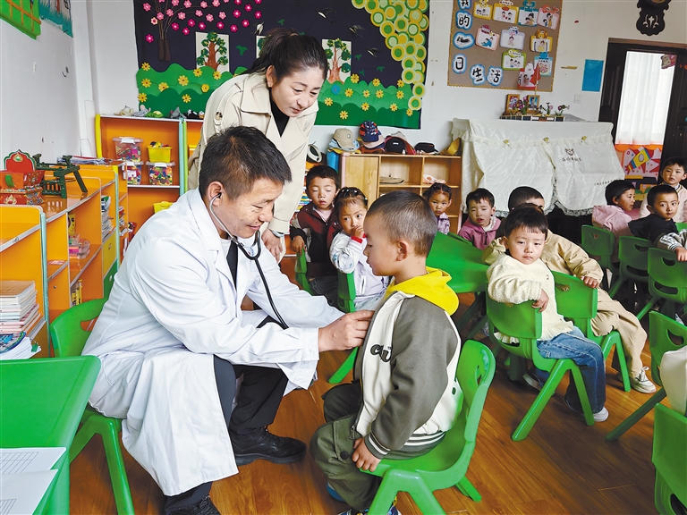 连日来,萨迦县驻村办联合县中心医院、县人社局、县教育局和援藏医疗工作组,在全县范围内针对“一老一小”群体开展了慢性病、高原病专项筛查行动。 图为医务人员为儿童进行先天性心脏疾病筛查。本报记者 姚闻 摄