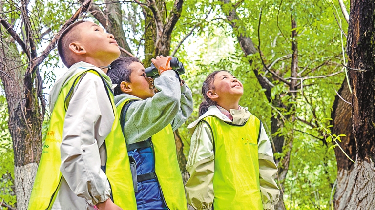 孩子们在拉鲁湿地用望远镜观察鸟类。