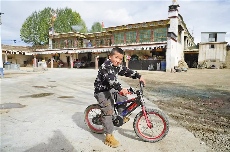 拉贵村村民旺堆家的小朋友在硬化路面上骑车玩耍。 本报记者 扎西顿珠 摄