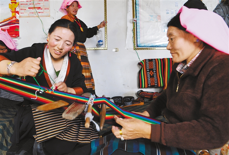图为木托村妇委会主任措吉卓嘎(左前)和合作社成员切磋编织技艺。新华社记者 张汝锋 摄
