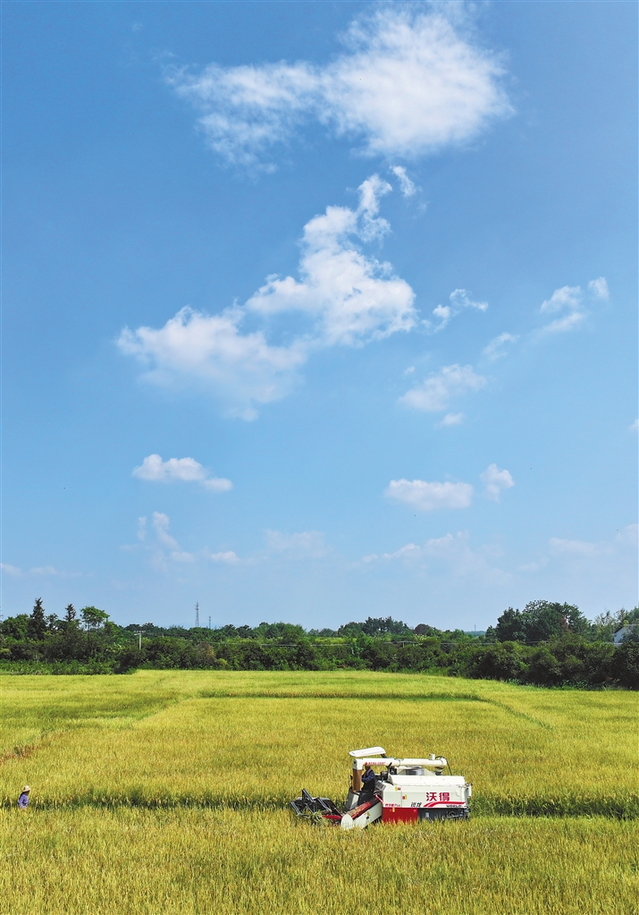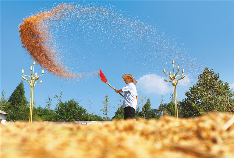 金秋时节,瓜果飘香、田野金黄,农民抢抓晴好天气,收获劳动果实。