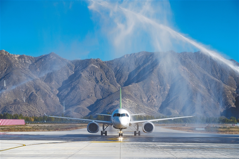 图为C919飞机降落在拉萨贡嘎国际机场。 本报记者 李梅英 本报通讯员 徐炳南 摄