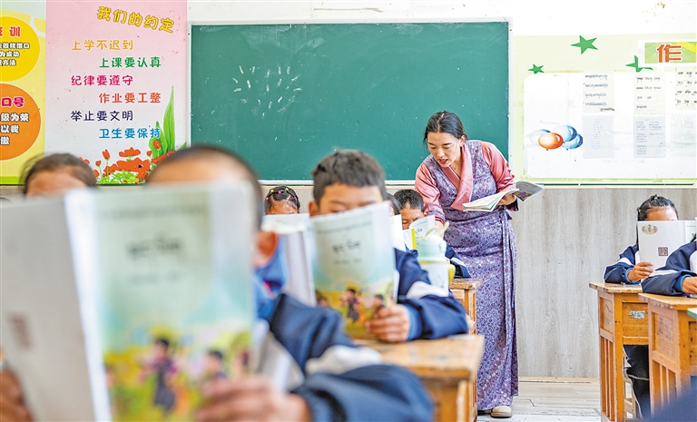 在娘蒲乡中心小学,娘蒲乡中心小学藏文老师格桑曲珍在上藏文课。格桑曲珍曾经也是该校学生。