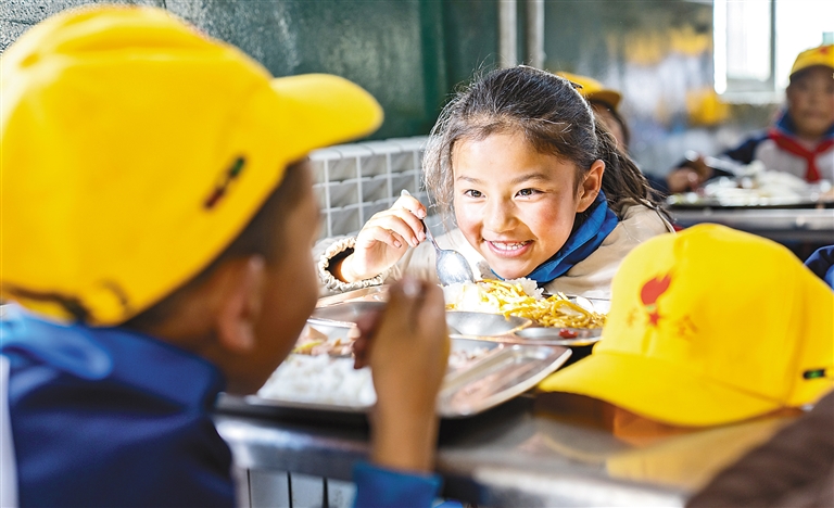 娘蒲乡中心小学的学生在食堂用餐。新华社记者 丁增尼达 摄