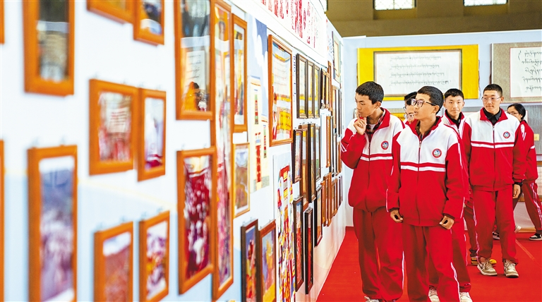 左图:学生在自治区首届中小学艺术展演活动获奖作品展厅内参观(9月25日摄)。