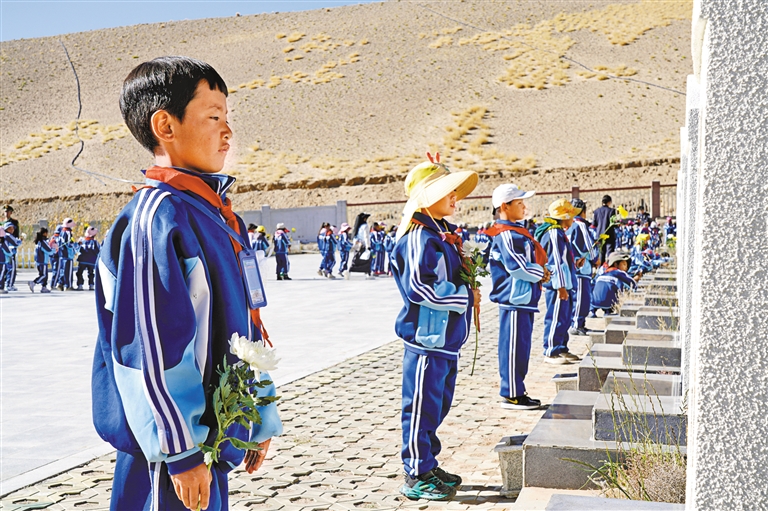 ②:阿里陕西实验学校少先队员向烈士敬献鲜花。