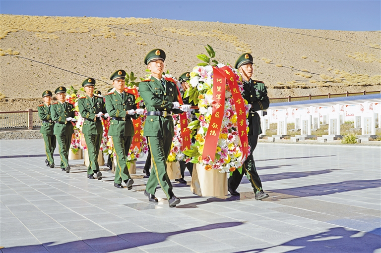 9月30日上午,阿里地区党员干部、解放军、学生及群众800余人前往狮泉河烈士陵园举行纪念活动。随着《义勇军进行曲》雄壮激昂的旋律奏响,各界代表齐声高唱中华人民共和国国歌。国歌唱毕,全场肃立、脱帽,向烈士默哀。深情的《献花曲》奏响,10名礼兵稳稳抬起阿里各方面敬献的5个大型花篮,正步走向烈士纪念碑,将花篮敬放在纪念碑前。