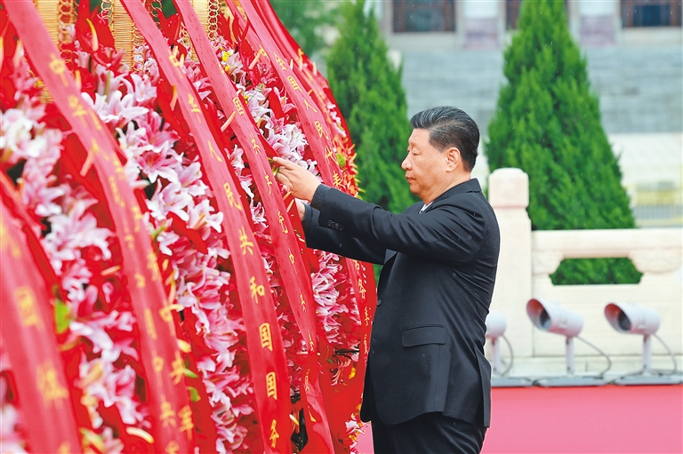 习近平迈步上前,仔细整理花篮缎带。随后,习近平等党和国家领导人缓步绕行,瞻仰人民英雄纪念碑。