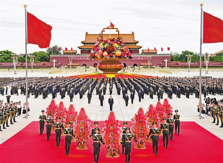 纪念碑前,2400多名各界代表手持鲜花,列队肃立。他们中有耄耋之年的老战士、老同志,有胸前佩戴着红飘带的烈士亲属,有国家勋章和国家荣誉称号获得者代表,有受表彰的民族团结进步模范代表,有朝气蓬勃的青年学生和少年儿童。