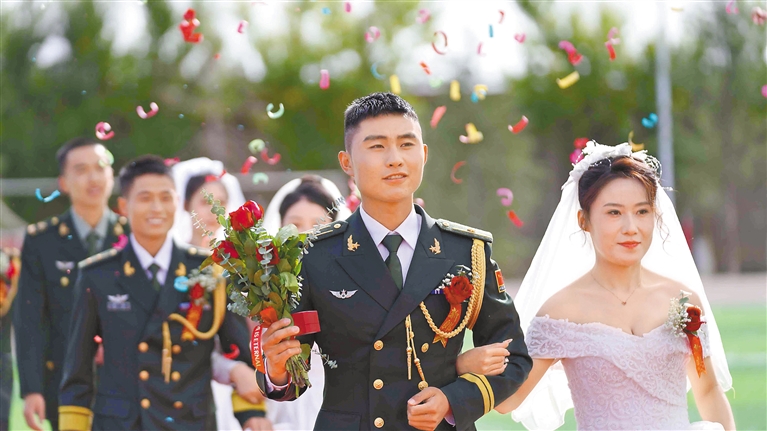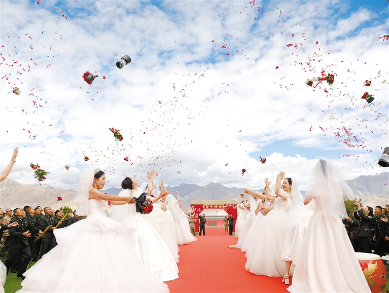 10月4日,西藏军区某部举办第四届“情系边疆、爱洒高原”集体婚礼,26位新娘自五湖四海而来,与该部官兵携手步入婚姻殿堂。