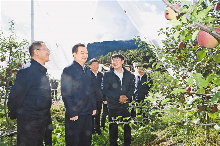 在巴宜区百巴镇百巴村松赞帐篷营地、增巴村烟台大山果业开发有限公司,王君正详细了解了乡村文旅融合、生态产业发展等情况。他指出,要加快推动文化旅游产业发展,坚持以文塑旅、以旅彰文,因地制宜探索新业态、新模式,培育品牌,惠及群众,扩大影响,形成合力。坚持在保护中发展、在发展中保护,统筹生态修复和生态惠民,着力加强交通等基础设施建设,赋能乡村全面振兴。坚定不移把培育产业、发展产业、壮大产业摆在重要位置,立足特色优势资源,加强农牧业技术推广应用,加快地方特色品种选育和良种繁育推广,加大典型宣传力度,发挥示范引领,促进乡村产业振兴。完善利益联结机制,持续发展壮大村集体经济和实体产业项目,推动农业增效益、农民增收入、农村增活力,实现各民族共同发展、共同富裕。