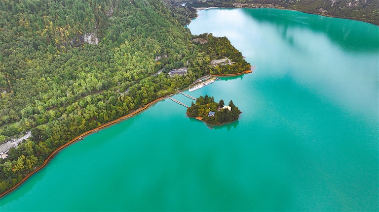 图为10月5日拍摄的西藏林芝市工布江达县巴松措湖心岛景色(无人机照片)。新华社记者 晋美多吉 摄