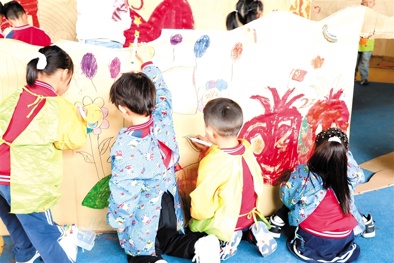 上图:孩子们围在用手绘作品组成的“蛋糕”旁。
