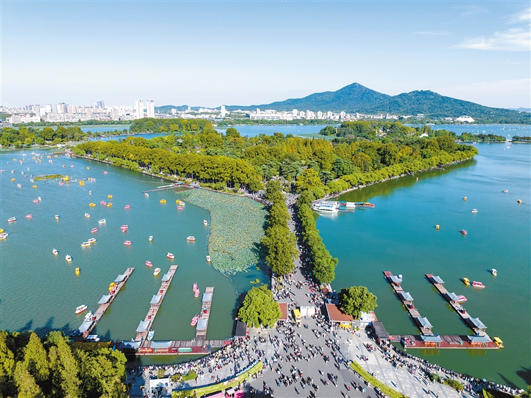 图为10月2日,人们在江苏省南京玄武湖景区参观游览(无人机照片)。新华社发(杨素平 摄)