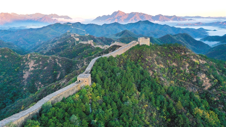 图为10月7日在河北省承德市滦平县拍摄的金山岭长城云海景观(无人机照片)。新华社发(周万平 摄)
