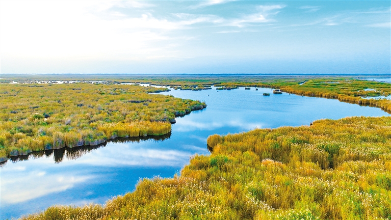 图为在新疆巴音郭楞蒙古自治州博湖县拍摄的博斯腾湖芦苇湿地(10月6日摄,无人机照片)。新华社发(年磊 摄)