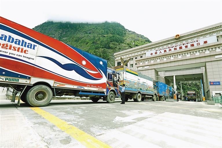 图为10月5日,即将从日喀则市吉隆口岸出境的尼泊尔货车。 本报通讯员 肖富贵 摄