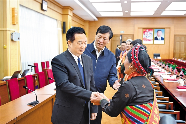 10月11日上午,自治区党委书记王君正在拉萨会见我区受表彰的全国民族团结进步模范集体代表和模范个人。这是王君正与受表彰的全国民族团结进步模范集体代表和模范个人握手。本报记者 旦增西旦 摄