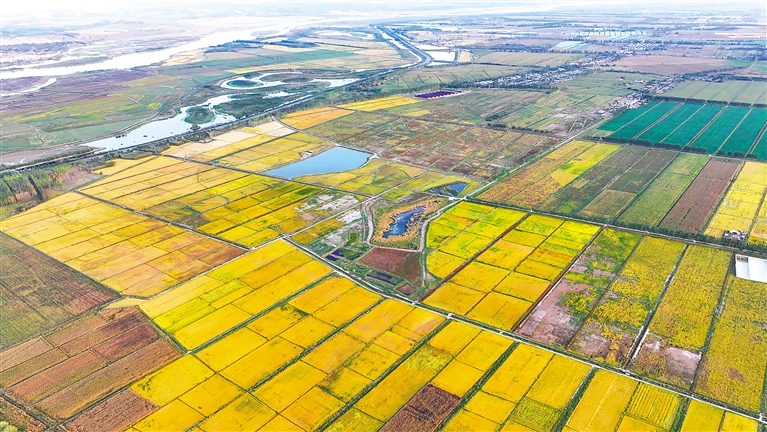 这是9月25日拍摄的宁夏银川市贺兰县金贵镇黄河岸边的农作物(无人机照片)。