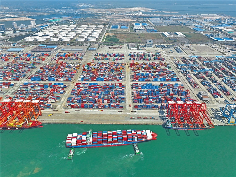 图为10月13日,一艘集装箱货轮在广西北部湾港钦州港区码头靠泊(无人机照片)。 新华社记者 周华 摄