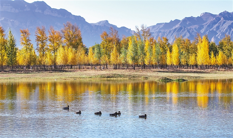 图①:10月12日,水鸟在河北省张家口市阳原桑干河国家湿地公园游弋(无人机照片)。新华社发(武殿森 摄)