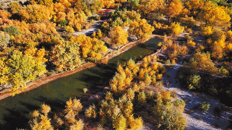 图②:10月12日在甘肃省敦煌市黄渠镇拍摄的胡杨林(无人机照片)。新华社发(张晓亮 摄)
