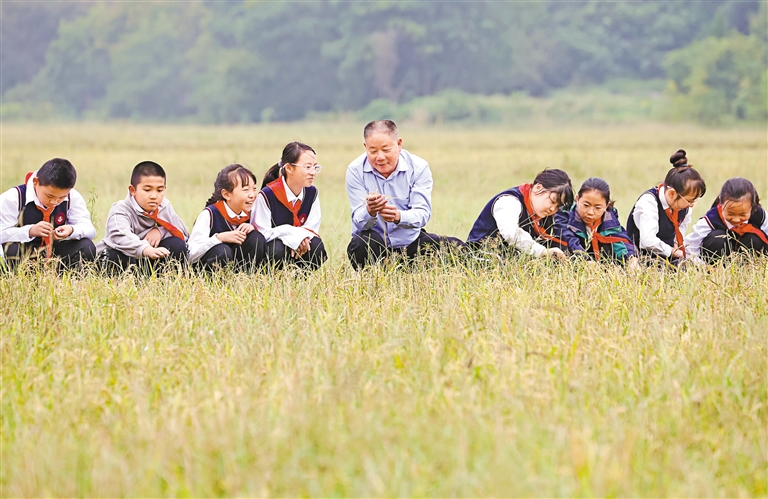 10月16日是世界粮食日,各地开展主题教育活动,增强孩子们爱惜粮食、节约粮食的意识。 图为志愿者在江苏省镇江句容市天王镇戴庄村为小学生讲解农作物种植知识。