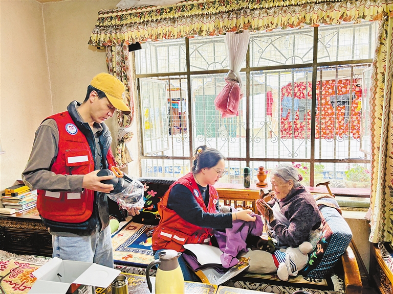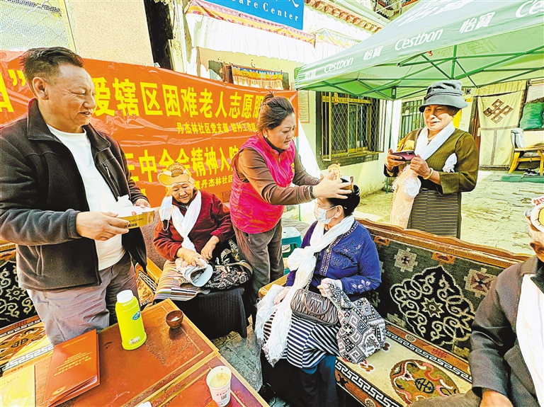 图为冲赛康社区志愿者为老人送去生活用品。本报记者 央金 摄